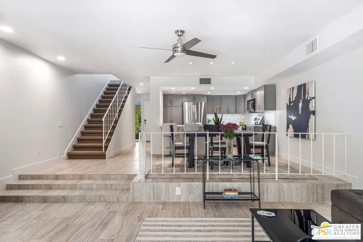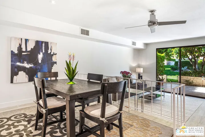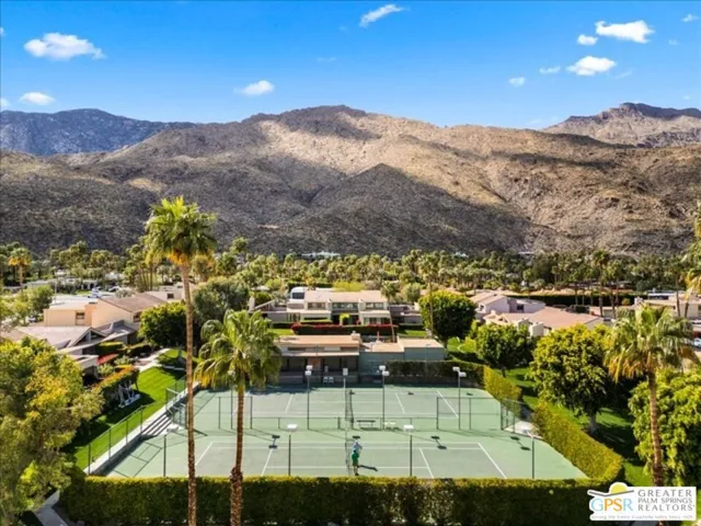 DESIGNED BY RENOWNED ARCHITECT HUGH M. KAPTUR, this exceptional South Palm Springs condo seamlessly blends mid-century modern with contemporary comfort. Expansive sliders showcase BREATHTAKING SAN JACINTO MOUNTAIN VIEWS, while sleek lines and sophisticated decor create a warm, inviting atmosphere. Inside, TWO PRIMARY ENSUITES offer space and privacy one featuring a fireplace, spectacular mountain views, and a private balcony. Centered around a fireplace, the living rooms opens effortlessly to a LARGE PATIO OVERLOOKING THE POOL AND LUSH LANDSCAPE, perfect for relaxation or entertaining. An attached garage with ample storage, in-unit laundry, and a DOWNSTAIRS BATHROOM complete with a shower enhance convenience, making this home ideal for both vacation retreats and full-time living. Set within a gated community offering RESORT-STYLE AMENITIES including two POOLS, two SPAS, TENNIS COURTS, a CLUBHOUSE with a FITNESS ROOM, and citrus-lined greenbelts this home is just moments from the best dining, shopping, and outdoor recreation in Palm Springs. An incredible chance to own a slice of Palm Springs in a prime location!