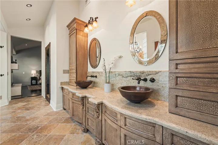 The primary suite feels like a retreat with a spa-inspired bathroom featuring custom cabinetry, elegant vanities, a handcrafted hammered copper soaking tub, glass block details, and a hidden walk-in closet.