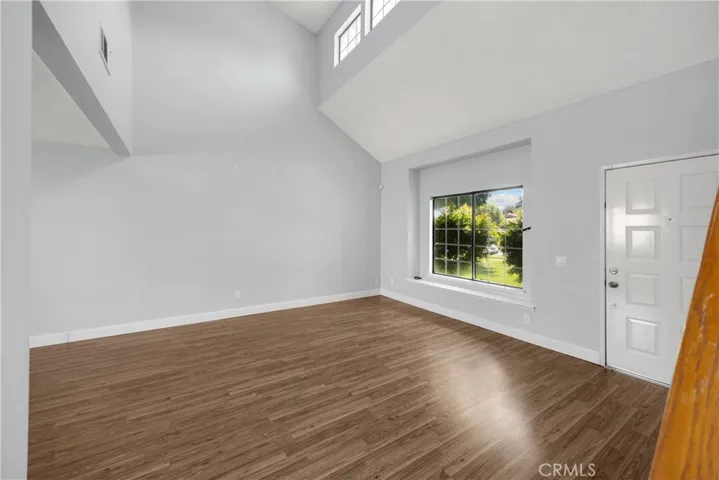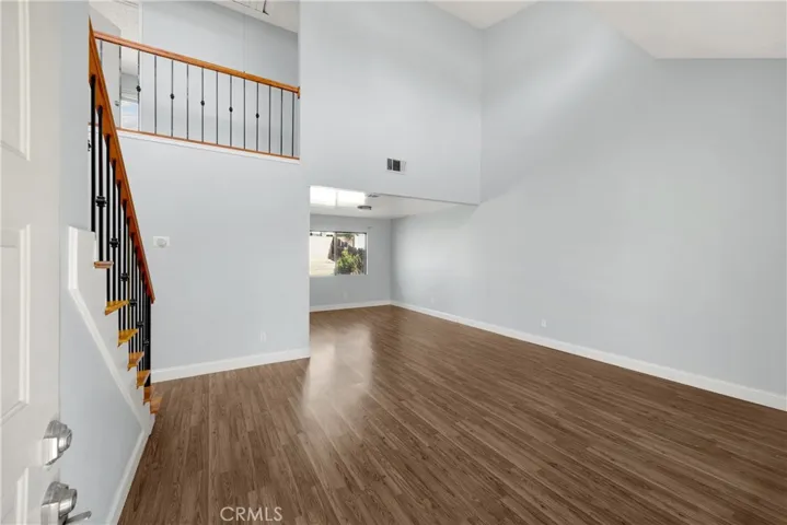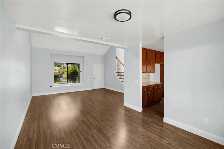 Step inside to a bright, two-story living room that flows seamlessly into the dining area. The interior has been freshly painted, and modern flooring runs throughout for a clean, updated look. The dining room opens directly to the kitchen, which boasts ample cabinetry, granite countertops, and plenty of space for cooking and entertaining.