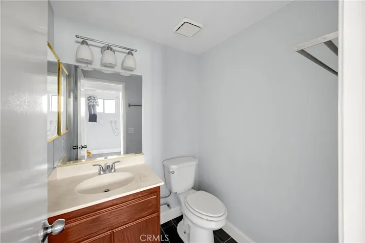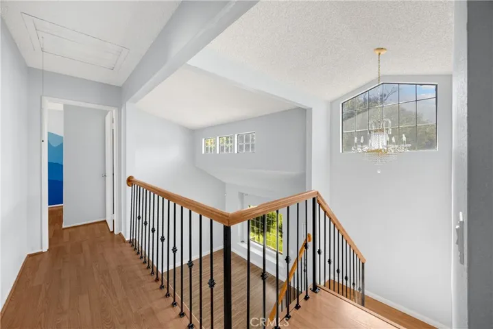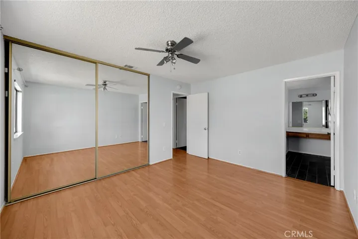 Upstairs, a wooden staircase with modern metal balusters leads you to three bedrooms, each with ceiling fans and stylish flooring. The primary suite includes mirrored closet doors, a spacious en-suite bathroom, and a separate vanity area. Additional bathrooms feature tile flooring and tub/shower combinations.