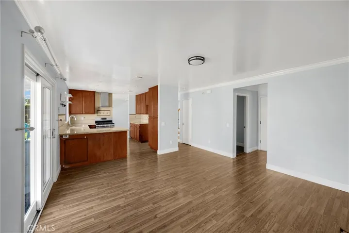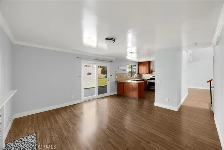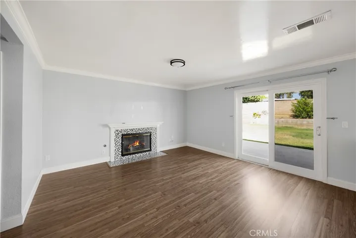 The inviting family room features crown molding and double sliding doors that open to the backyard. Downstairs also includes a convenient half bath and a laundry room with natural light.