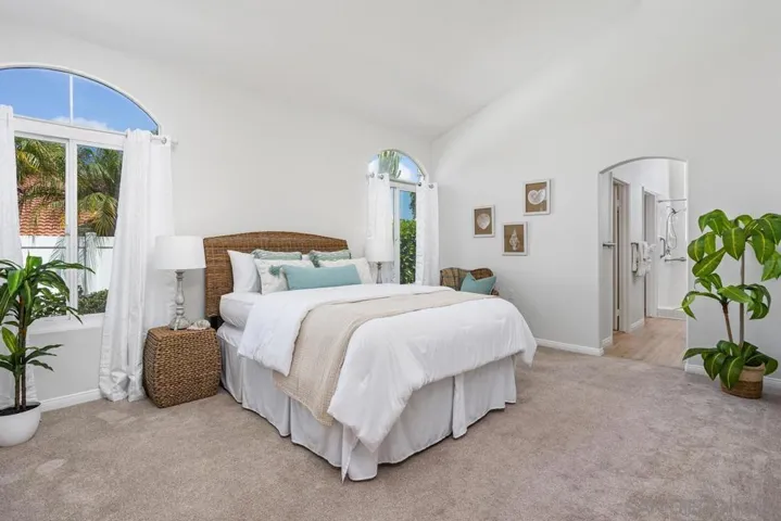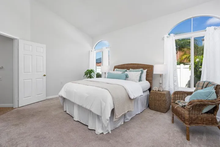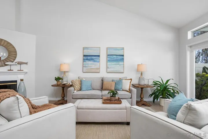 Experience coastal living at Villa Trieste, a desirable 55+ gated community in Oceanside. This 1,860 sq. ft. single-story townhouse with a versatile loft (optional 3rd bedroom) offers 2 bedrooms, 2 bathrooms, and a bright, open floor plan. Natural light pours through soaring ceilings and three sets of French doors—two opening from the family/dining room and another from the kitchen—inviting ocean breezes inside. The kitchen blends function and charm with granite counters, stainless steel appliances, and a cheerful breakfast nook framed by windows. The spacious primary suite includes vaulted ceilings, dual sinks, a large walk-in closet, and a beautifully tiled shower. A comfortable guest bedroom and bathroom complete the main floor, while the loft provides flexible space for an office, hobby room, or visiting family. Step outside to your private backyard oasis with a pergola-covered patio, lush landscaping, and distant ocean views peeking over rooftops—perfect for relaxing with friends or enjoying quiet mornings. Additional highlights include central A/C, indoor laundry, and an attached 2-car garage. Villa Trieste offers resort-style amenities including a clubhouse, pool, and spa, all just minutes from shopping, dining, and the beach.