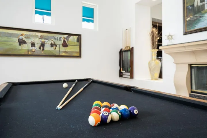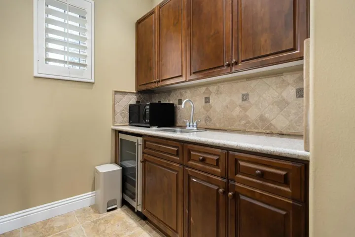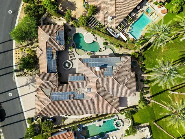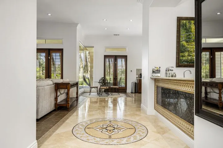 Experience the pinnacle of resort-style country club living at 56985 Village Drive, located in the highly sought-after Palms Country Club. This fully furnished, European Chateau-inspired estate offers 4 bedrooms, 4.5 bathrooms, and a private casita with its own entrance, kitchenette, dining, living, office area, bedroom, and spa-like bathroom with soaking tub, ideal for guests, extended family, or long-term visitors. Every detail of this home has been designed for comfort, elegance, and entertaining. Enter through a monumental private wooden gate into a grand courtyard featuring a central fountain, setting the tone for a residence that blends sophistication with timeless charm. Inside, the formal entryway opens to a formal living room with a billiards table and double-sided fireplace. To the right, a formal dining room, and off the kitchen, the breakfast room which offers expansive windows overlooking the golf course, offering stunning views of the greens, mountains, and palm trees. The chef’s kitchen is a culinary dream, featuring a Sub-Zero refrigerator, commercial-grade stainless steel appliances, dual sinks, an eat-up island, and abundant custom built-ins. The residence also includes a large wet bar with wine fridge, perfect for entertaining family and friends. The primary suite serves as a private retreat, with a spa-like bathroom complete with dual vanities, soaking tub, shower, and a generous walk-in closet. Two additional bedrooms provide ample space, while multiple skylights, custom shutters, and ceiling fans throughout the home create an atmosphere of elegance and comfort. A spacious laundry room and 3-car garage, including room for a golf cart, add convenience and practicality. Step outside to a backyard that opens directly onto the golf course, surrounded by mature, lush landscaping. Stone pavers guide you through multiple entertaining areas, including a large covered patio with cathedral ceilings and ceiling fans, and an outdoor built-in BBQ. The pool area is a showstopper, with a large baja shelf, a river-style water feature that wraps around the property, and a waterfall spa. This estate provides seamless access to La Quinta’s premier country club amenities, including a lively social calendar, clubhouse, dining, shopping, and nearby equestrian venues, polo fields, and tennis garden. Designed for those who desire luxury, privacy, and an elevated lifestyle, 56985 Village Drive is the ultimate combination of sophistication and desert charm.