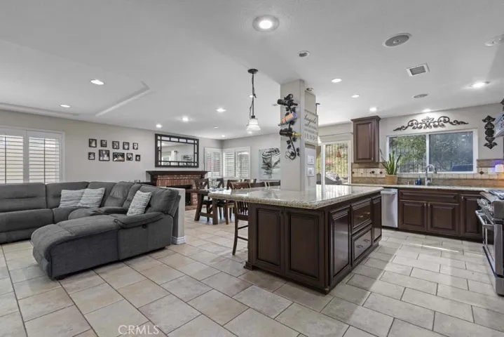 This 3-bedroom, 2.5-bath home features a bright, open floor plan with fresh interior and exterior paint, porcelain tile flooring downstairs, and a cozy wood-burning fireplace with gas hookup. The remodeled gourmet kitchen boasts granite countertops, custom cabinetry, travertine backsplash, a massive 48” 6-burner professional range with griddle, large center island with built-in beverage fridge, and newer dishwasher and disposal.