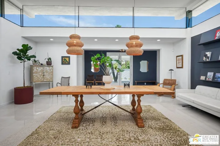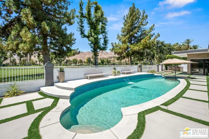 Welcome to 71183 Country Club Drive, a true mid-century gem located in the prestigious Thunderbird Country Club neighborhood of Rancho Mirage. This custom-designed home, built in 1964, exudes timeless mid-century elegance while adding a touch of modern sophistication to this desert retreat. Enter through a private gated motor court featuring a distinctive V-shaped support. The open living areas beautifully connect indoor and outdoor spaces, filled with natural light from the floor-to-ceiling glass and clerestory windows. The designer furnishings complement the architecture, creating a harmonious ambiance throughout the home. Restored and fully updated, this residence spans 4,874 square feet and includes four bedrooms, including a luxurious en-suite primary bedroom, and four stylish bathrooms. It is perfect for multi-generational living or hosting guests. Dine alfresco under the covered patio as you enjoy stunning sunsets over the fairway, surrounded by the breathtaking desert mountains. Key features of this property include two fireplaces, two walk-in closets, a chef’s kitchen, a den, skylights throughout, a drought-resistant landscape, a two-car garage, a swimming pool, a spa, a barbecue area, engineered lawns, and much more. This desert retreat offers the finest in Southern California living.