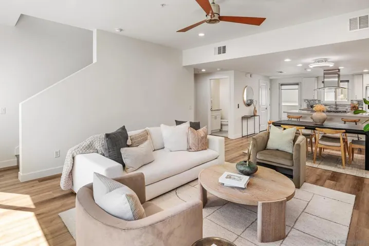 Urban Elegance in the Heart of Hillcrest!! Experience elevated city living in this sophisticated townhome, ideally located in the vibrant heart of Hillcrest with LOW HOA! Featuring a spacious open floor plan, soaring cathedral ceilings, and an abundance of natural light, this home blends modern upgrades with timeless style. Enjoy brand-new flooring throughout, fresh designer paint, and updated lighting that enhances every room. The gourmet kitchen is a chef’s dream, boasting stainless steel appliances, a walk-in pantry, and a peninsula with bar seating—perfect for casual dining or entertaining. The kitchen flows seamlessly into the expansive great room, where a cozy fireplace and oversized windows create an inviting space to relax or host guests. Upstairs, you’ll find two generously sized bedrooms, each with its own ensuite bathroom, plus an optional third bedroom or home office—ideal for today’s flexible lifestyle. Step outside to your private terrace and take in breathtaking ocean views and sparkling city lights—an exceptional setting for entertaining or unwinding. Located just steps from San Diego’s best restaurants, boutiques, and parks, this townhome offers the perfect balance of luxury, comfort, and convenience in one of the city’s most walkable neighborhoods.