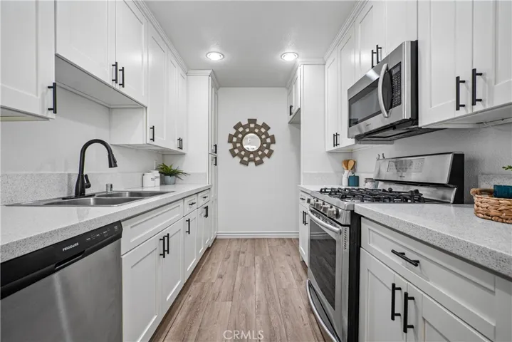 This single-level ground-floor condo features two bedrooms and two bathrooms, including a primary suite with an attached bath and a spacious walk-in closet. The remodeled kitchen is finished with white shaker cabinets, quartz countertops, and recessed lighting, and it opens to a dining area and a generous living room that flows seamlessly to a private patio—perfect for relaxing, entertaining, barbecuing, or enjoying with pets. The home also includes laminate flooring throughout and the convenience of a private washer and dryer inside the unit.