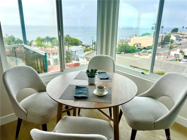 Beautifully remodeled, top-level, corner unit condo with panoramic Ocean and Catalina Island views in charming Wood’s Cove. Just a block from the beach entrance, this turn-key, furnished unit has been thoughtfully designed with luxury features and an open floor plan to take advantage of the sweeping Coastline views. Cozy, decorative fireplace and contemporary Bosch decor in the Living Room, New kitchen with all white cabinets, granite counters, and top-quality appliances (instant Induction stove), wood laminate floors, and opens to tasteful Living spaces and ocean view dining. The Primary Suite also has ocean views and a large, flat-screen TV. The luxurious bathroom has a large, step-in shower, granite counters, and new tile floors. Step out to a covered outdoor patio/deck area with panoramic views. All this, just steps away from Laguna Beach’s shops, restaurants, and an easy walk into the Hip District and downtown Village area. Available for short-term (31+ days) and seasonal rentals, price listed is off-season rate – please inquire.