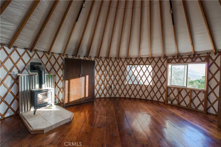 Set across 5 private acres behind a gated road, the property includes three unique dwellings. The primary residence, known as “The Barrel House,” expands over 2,000 square feet with panoramic ocean views, two living rooms, and a large deck for seamless indoor-outdoor living. Upstairs, three bedrooms feature floor-to-ceiling windows framing oak trees, valleys, and the Pacific beyond.