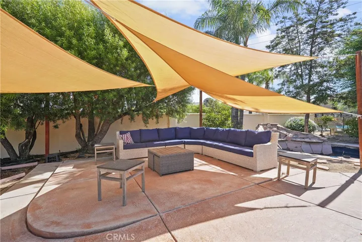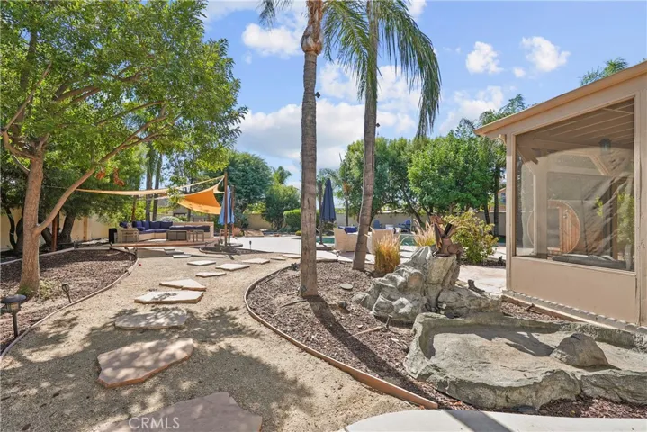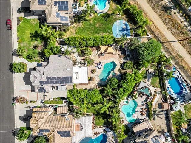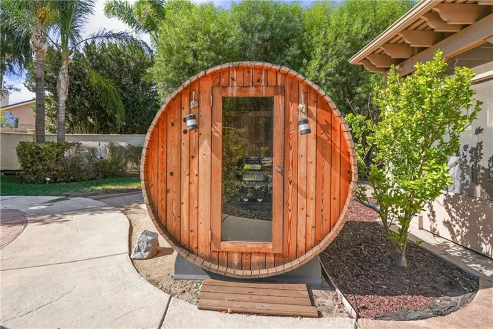 In the heart of the home is a beautifully renovated kitchen which features quartz counter tops, stunning Mahogany cabinets with endless amounts of storage. Thoughtfully designed with a built-in coffee bar, and abundant cabinet space, with pull out drawers for easy access to your daily needs. A space that inspires both quiet mornings and lively meals. Nestled in the living room you will find a beautiful fireplace with a cozy atmosphere, with a new 10 foot sliding door to access your oasis backyard. As you walk up to the second floor you are invited by lovely vinyl wood flooring covering upstairs. The primary suite is a true retreat, with beautiful high ceilings, a updated luxury wall to wall walk in shower, and stunning french doors opening to a private balcony overlooking a serene view of the sparkling pool, bubbling spa, and personal sauna. Whether you’re sipping coffee at sunrise or watching the sunset, this space invites peace and reflection. This backyard is perfect for all family get-togethers, offering over 16,000 sqft in privacy. The backyard is surrounded by a crisp white block fence, and beautifully landscaped trees to provide even more privacy. This beautiful home screams curb appeal on a private cul-de-sac, and a welcoming driveway with a 3 car garage that is epoxied for an even more elevated experience. The garage gives additional storage space with over hanging storage shelves, as well as built in cabinets and work station for your mechanical needs. This home provides more than just your average needs but has also been thoughtfully upgraded and equipped with necessary needs for your family which includes, RV parking, ,and 27 paid-off solar panels make everyday living effortless, newer windows for energy efficiency, newer tile roof, water softening system, recent updated pool heater, upstairs bedrooms are equipped with individual AC control systems. With no Mello-Roos, you’ll enjoy lower costs in a neighborhood close to parks, schools, and shopping. This where your next chapter begins!