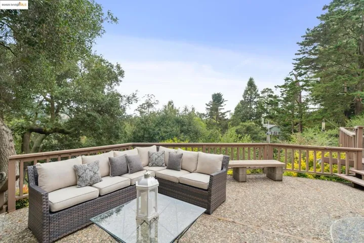 New listing. Charming Montclair bungalow surrounded by lush gardens. The experience begins in the spacious light-filled open floor plan on the lower level where a welcoming living room flows seamlessly into a dramatic dining room. In the dining room, walls of floor-to-ceiling windows frame sweeping verdant views of the hills. French doors extend the experience outdoors to an expansive entertaining deck, ideal for dining al fresco or hosting friends. At the heart of the home, a two-sided gas fireplace adds warmth to both the living room and kitchen. Designed with the modern chef in mind, the kitchen boasts a generous center island, abundant counter space, and ample cabinetry. A hall bathroom completes the lower level. On the main level of the house, the serene primary suite features a fireplace and primary bathroom with soaking tub and double-sink vanity. Two additional bedrooms share a conveniently located hall bath. A detached studio tucked beneath the garage is perfect for a home office. Just minutes to the Montclair Village, parks and transportation. Open 2-4:30pm.