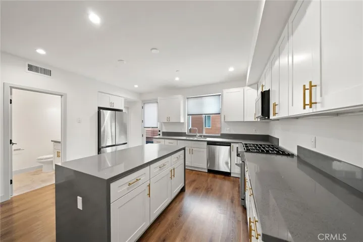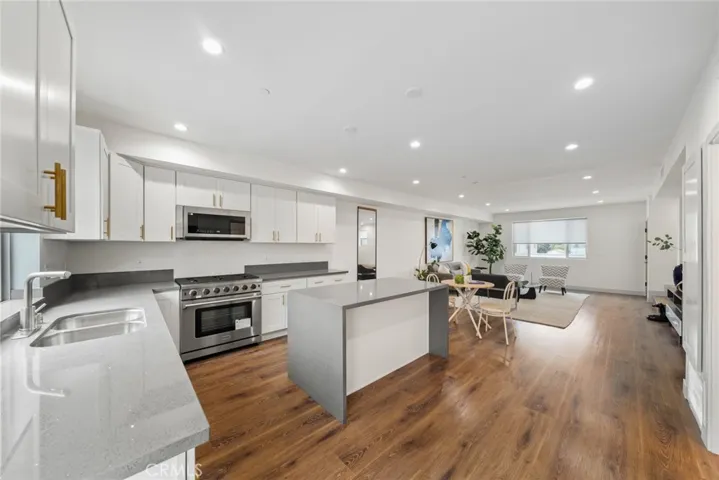 Step into a gourmet kitchen featuring a center island, walk-in pantry, and premium stainless steel appliances, including a dishwasher, 6-burner gas stove, microwave, and refrigerator. The open floor plan seamlessly connects the kitchen to a spacious living/family room, making it perfect for entertaining or relaxing.
