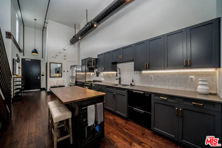 If you enjoy loft living, welcome to this stunning, remodeled top-floor loft, a true entertainer’s dream tucked into the Marina’s most dynamic and creative streets. Thoughtfully curated with high-end finishes and smart design, this condo blends dramatic architecture with modern comfort. Soaring 17+ foot ceilings and a wall of floor-to-ceiling windows flood the space with natural light, framed by a custom motorized drapery that adds a bold designer touch. The open-concept layout includes a custom speakeasy-style bar, perfect for unwinding after a long day or kicking off an evening of entertainment or relaxation. The kitchen is a showpiece, featuring quartz countertops and a suite of top-tier appliances including a Viking Pro refrigerator, Ilve range, and Fisher & Paykel dishwasher. Both bathrooms are elevated with copper sinks, marble counters, custom-tiled showers, smart mirror lighting, and Toto bidet toilets. A private guest bedroom with en-suite bath is located on the main level, while the upstairs mezzanine hosts a spacious primary suite with a walk-in closet, room for a home office, and serene architectural views. Additional highlights include new HVAC 2024, custom cabinetry and doors, upgraded lighting, EV charging, guest parking, and a rooftop deck with city views.