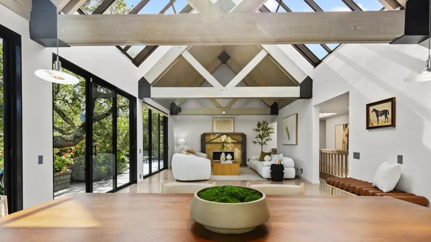 This is a home that’s all about light, views, and easy living. Whether you’re gathering with friends, finding a quiet corner to unwind, or just enjoying the beauty of nature right outside your door, this home has it all. As you arrive, a soothing water feature sets a calming tone. Step inside to a dramatic living room with soaring open-beam ceiling and a sliding skylight that fills the space with natural light and fresh air. The open kitchen and dining areas make gatherings effortless, flowing easily for everyday living or entertaining. The primary suite is a true retreat, with a fireplace, a spa-like bathroom, and a generous walk-in closet. With four bedrooms and four bathrooms in total, plus a private-entry studio perfect for guests, work, or creative pursuits. Multiple decks and patio offer sweeping views of the hillsides and valley beyond. This home includes a tropical-themed spa room with a hot tub and sauna, a wellness escape right at home. Portola Valley Ranch amenities include a vineyard, two swimming pools, tennis, a fitness facility, community garden, community room, access to hiking trails, a dog park, and so much more. Located near shops and restaurants, Stanford, Silicon Valley, commute routes, and midway between San Francisco & San Jose international airports.