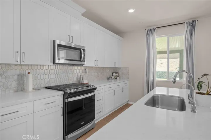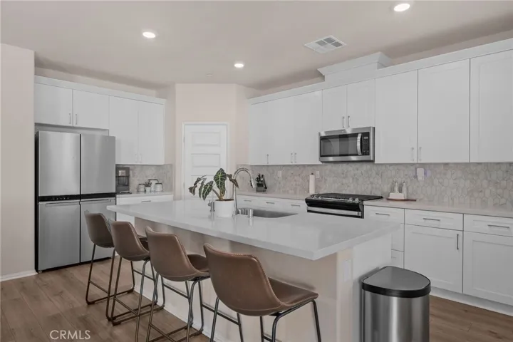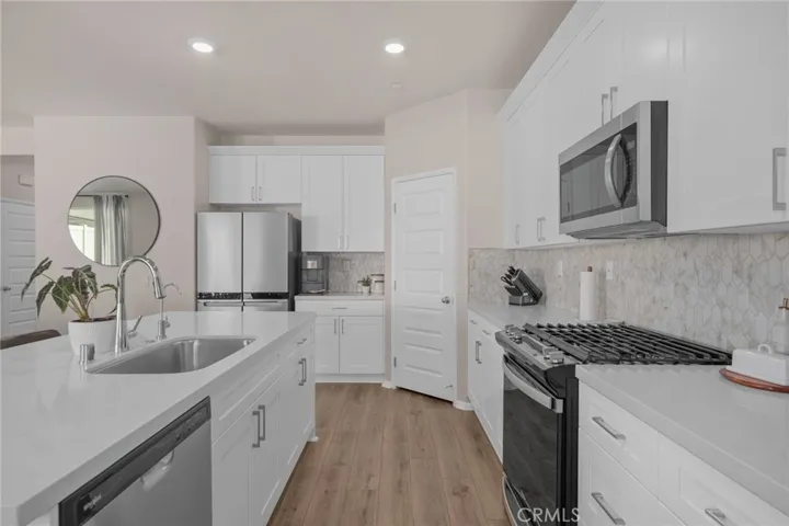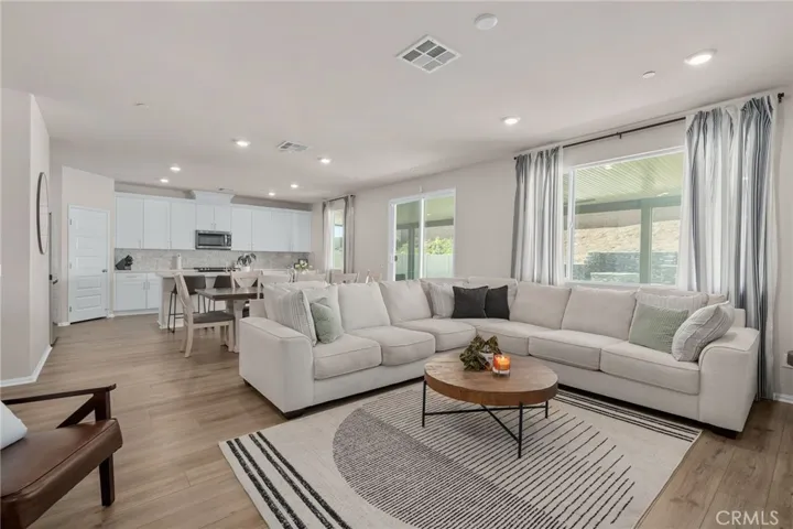 The spacious family room is the heart of the home, showcasing a cozy fireplace framed with a custom shiplap enclosure. The open-concept kitchen overlooks the family room and dining area, offering a large kitchen island, quartz countertops, porcelain tile backsplash, walk-in pantry, and built-in cooktop—perfect for both everyday living and entertaining.