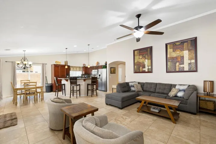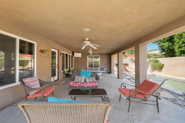 No HOA, No Mello Roos, and no short-term rental restrictions–this is the investment you’ve been waiting for! Whether you’re looking for a proven income property or your own desert retreat, this 4-bedroom, 2-bath saltwater pool home checks every box.Step inside to an open floor plan with vaulted ceilings, stacked stone accents, tile floors in the main living areas, and a versatile office/den. The kitchen features granite countertops, a spacious island with bar seating, and opens seamlessly to the dining and living room–perfect for entertaining.The primary suite offers a walk-in closet, dual vanities, soaking tub, separate shower, ceiling fan, and abundant natural light. Three additional guest bedrooms are located opposite the primary for added privacy, each with ceiling fans and cozy carpeting. An extra flex space provides endless options for a home office, media room, or reading nook.The backyard is designed for relaxation and entertaining, with an oversized covered patio, built-in BBQ, wood-burning fire pit, tanning deck, and low-maintenance landscaping. Conveniently located near shopping, dining, and the Festival grounds, this home truly has it all. Rental history available upon request–don’t miss this must-see opportunity!