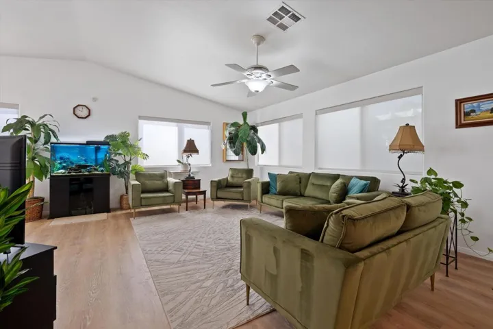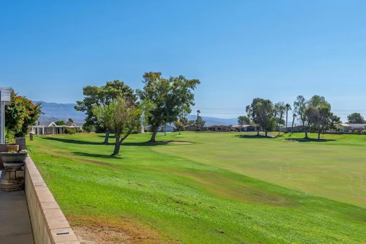 One of the Best Values in Tri-Palm Estates. Welcome to this beautifully maintained 3-bedroom, 2-bath single-family home offering an exceptional location on the golf course. With unobstructed southern views of the fairway and surrounding mountains, this residence delivers both serenity and style. The open and light-filled floor plan features a vaulted living room ceiling, updated flooring, and expansive windows framing the scenic outdoors. The kitchen is well-appointed with tile counters, upgraded stainless-steel appliances, and modern fixtures. Additional highlights include ceiling fans throughout, custom window coverings, and sun screens for energy efficiency. Outdoors, enjoy a wrap-around patio with covered areas, perfect for relaxing in sun or shade. The elevated garden offers lush citrus trees and space for herbs or vegetables–an ideal setting for those who enjoy gardening. The home also provides a two-car garage plus a golf cart garage. Tri-Palm Estates is a sought-after 55+ community offering remarkable value with free golf for 2 owners on title, clubhouse, restaurant, 2 community pools/spas, tennis and pickleball, shuffleboard. Just minutes from great shopping, dining, Costco, Acrisure Arena, casinos, entertainment venues, this property blends leisure, convenience, and lifestyle.