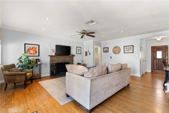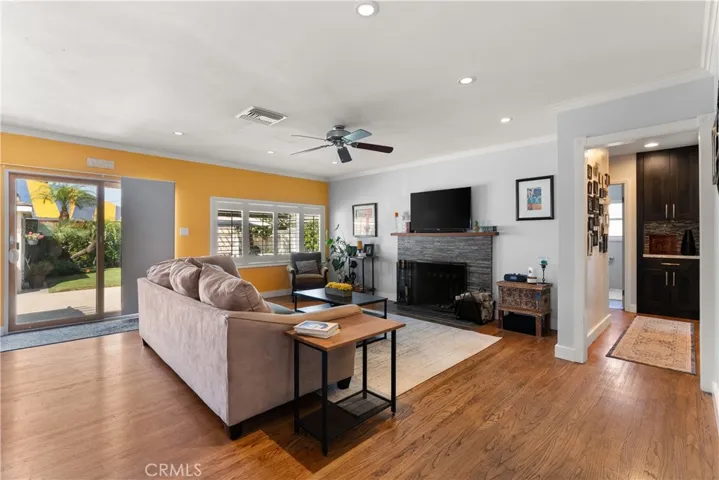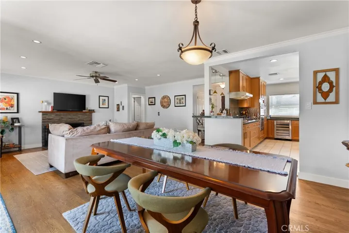 Step into this beautifully updated home, where an open-concept layout seamlessly connects the well-appointed kitchen, dining area, and living room. Sunlight fills the space, highlighting the cozy fireplace and offering easy access to the inviting patio. Thoughtful designer touches are found throughout, adding style and character to every room.