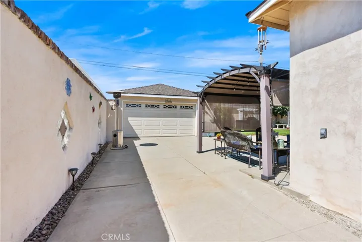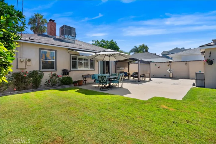 A long driveway leads to the detached two-car garage, which includes extra storage along with the washer and dryer. The backyard is a true retreat—meticulously maintained and featuring a built-in BBQ, a large awning for shade, fruit trees, and beautifully manicured landscaping.