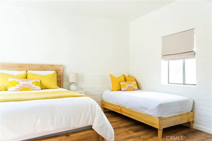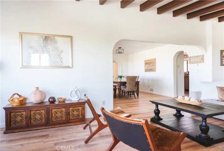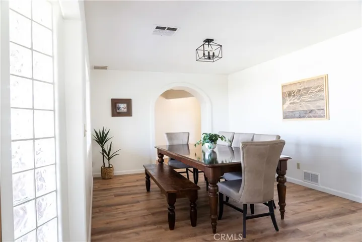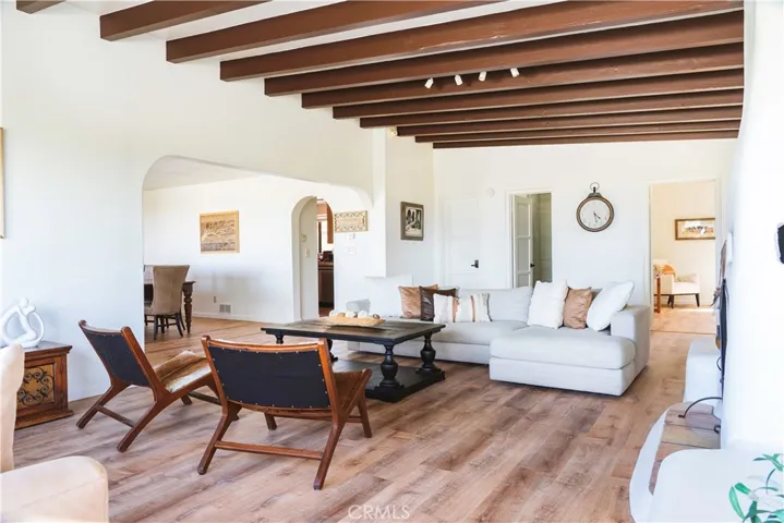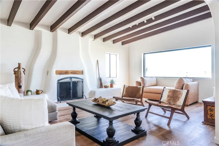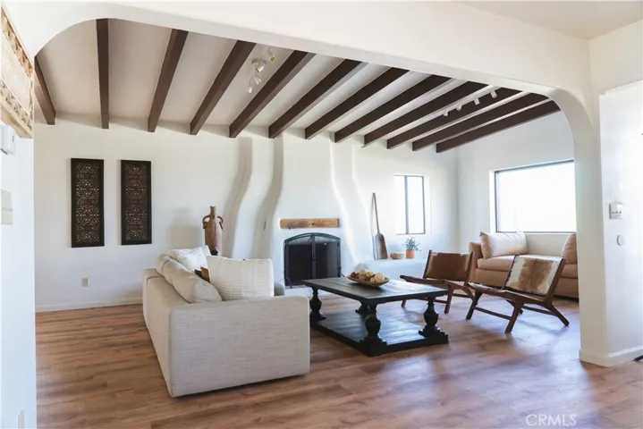 Offering over 2,000 square feet of space, this large 3 bedroom 2 bathroom home, encompasses the definition of a “unique” and open floor plan! The well-appointed foyer flows effortlessly into the rest of the living area, boasting high ceilings, craftsman modern Adobe-style finishes, vaulted open beam ceilings, tasteful built-in shelving, beautiful wood laminate flooring, and a custom-designed fireplace that centers the room.