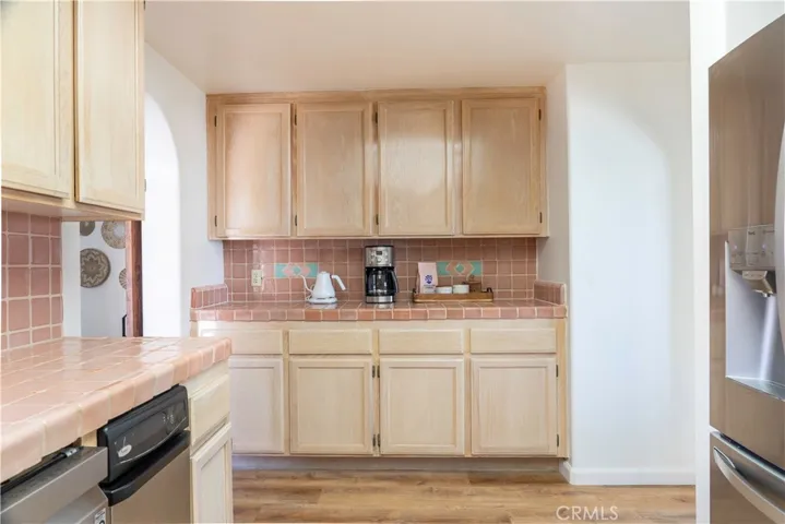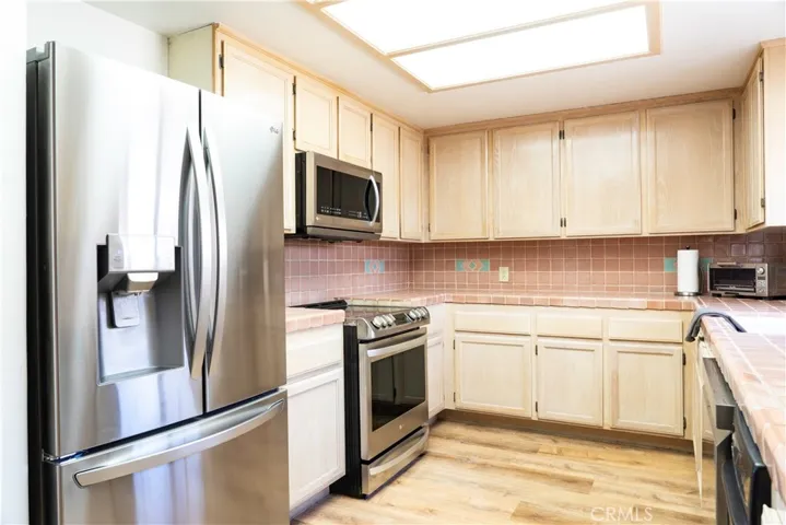 The large gourmet kitchen features stainless steel appliances, plenty of kitchen cabinets, fresh design elements, and Santa Fe countertops/backsplash! Just off the kitchen,find the formal dining room, perfect for holiday dinners or any type of gathering! Both guest bedrooms offer ample space, trendy wood laminate flooring, generous closets, and view windows. The full guest bathroom is outfitted with a remodeled walk-in shower, a modern vanity, and mosaic tile flooring!