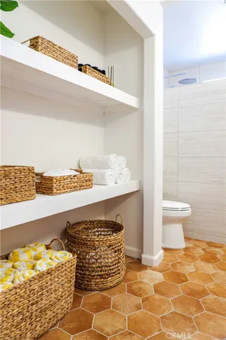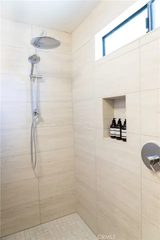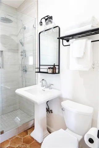 Stepping into the primary suite, you discover the perfect retreat at the end of the day, rivaling that of a boutique hotel. This area features more open beam ceilings, a custom light fixture, and a large primary bathroom showcasing a stunning door, dual vanity sinks, custom mirrors, and a sizable walk-in tiled shower.