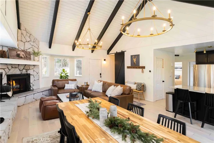 NEW PRICE!!!!Welcome to 695 Sutter Lane, a beautifully updated single-family residence tucked away in the desirable Arrowhead Woods community of Lake Arrowhead. This 3-bedroom, 2-bathroom chalet offers 1,540 square feet of comfortable living space on a generous 9,350 square foot lot. Recently refreshed with thoughtful updates, the home blends modern convenience with classic mountain charm. The main level features an open-concept layout with a warm and inviting living room centered around a stone fireplace, perfect for cozy evenings. The updated kitchen flows seamlessly into the dining area, making it an ideal space for entertaining and family gatherings. Two guest bedrooms and a full bathroom complete the main floor, while the upstairs is dedicated to a private master suite with its own ensuite bath.