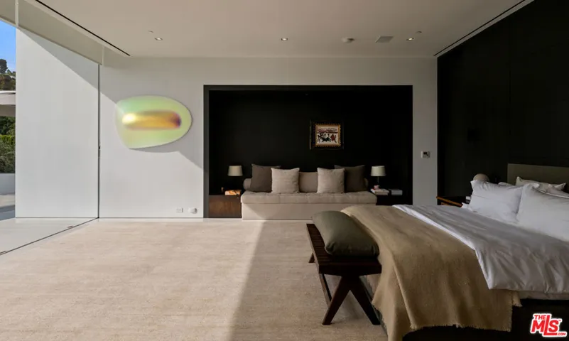 A stunning piece of architecture designed by XTEN Architects and recipient of the AIA Los Angeles Award for most influential architecture of 2020. Inspired by Stanley Kubrick’s Space Odyssey and set on a promontory on the most prime cul-de-sac in the Bird Streets. Enter through a private courtyard into high ceilings infused with natural light, walls of glass and polished terrazzo floors. Stylish and sophisticated with incredible walls for art, the property offers jetliner views overlooking Los Angeles to the ocean. Large living room, incredible kitchen/family room, professional theater, gym, dance studio, office, and much more. There is an incredible primary suite with dual closets and huge spa-like bathroom with steam shower and soaking tub. The entire house overlooks a spectacular infinity pool and large grassy yard. Additional amenities include an 8-car subterranean showcase garage. Show to pre-qualified clients only.
