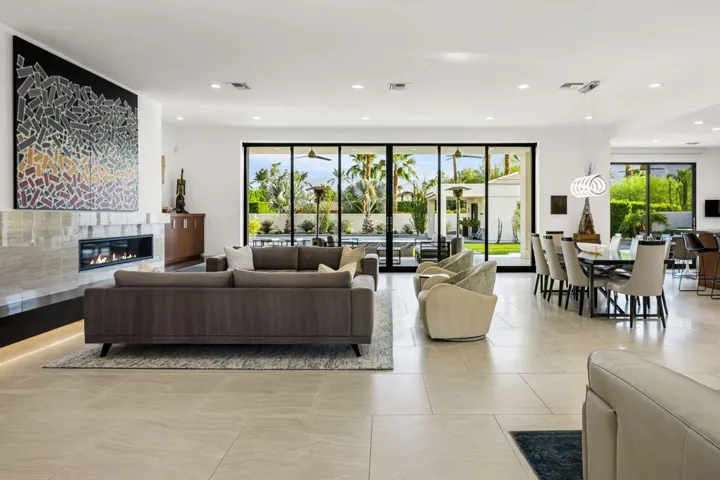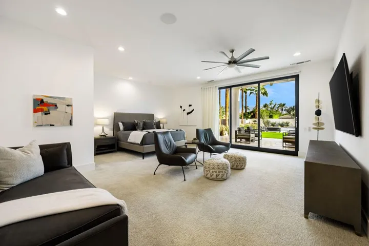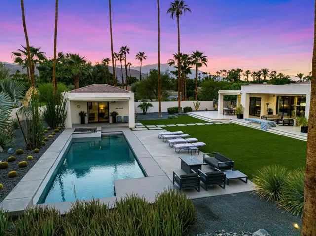 Welcome to 40700 Desert Creek, a striking contemporary estate in the exclusive gated community of Mission Ranch, Rancho Mirage. Rebuilt from the studs and meticulously maintained, this residence blends crisp architectural lines with warm details that embrace desert living. Set on a sprawling 36,590 square foot ultra-private corner lot with 4,591 square feet of interior space, the home offers 4 bedrooms, 4.5 baths, a detached guest house, and expansive entertaining areas designed for seamless indoor-outdoor living. The main living area showcases soaring vaulted ceilings, abundant skylights, and floor-to-ceiling glass doors, connecting the interiors to the outdoor living spaces. A dramatic raised hearth fireplace with custom built-ins anchors the great room, while Hunter Douglas automated blinds, custom window treatments, and smart-home technology place comfort at your fingertips. The chef’s kitchen is both beautiful and functional, featuring quartz counters, an oversized island with seating, SubZero refrigerator, commercial-grade stainless appliances, a wine fridge, and a sleek wet bar for effortless entertaining. The primary suite is a private sanctuary, complete with living area, spa-inspired bath with soaking tub and walk-in shower, dual custom closets, and direct access to the poolside terraces. Outdoor living is elevated with expansive patios, a covered outdoor kitchen, and an 11-foot fire feature overlooking the sparkling pool and spa. The detached guest house, thoughtfully positioned near the pool, offers a full bath and morning bar perfect for visitors or extended stays. The grounds are enhanced by citrus trees, low-maintenance desert landscaping with architectural lighting, and a large motor court with a three-car garage. Every detail of this property reflects careful design and pride of ownership, from ultra high-end finishes and fixtures to smart-home automation throughout. Centrally located near world-class dining, shopping, and golf, this estate offers a rare combination of privacy, sophistication, and modern desert lifestyle. An architectural gem designed for both everyday living and unforgettable gatherings.