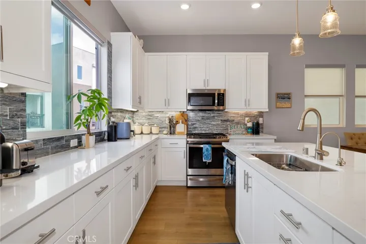 Nestled within the highly desirable gated Ponte Vista Master-Planned Community of Coastal San Pedro, 1642 W Saratoga Lane is a top of the line Plan Three, 4 Bedroom and 3.5 Bath, 1873SF Tri Level Luxury Home and offers the perfect blend of modern design, thoughtful upgrades, and a vibrant coastal lifestyle. This beautifully enhanced and upgraded residence combines comfort and sophistication with over $45,000 in owner improvements, making it truly move-in ready. Step inside to find a custom painted designer interior that compliments the home’s bright and inviting layout. The kitchen has been updated with a new designer tile backsplash, quartz countertops, spacious center island with seating for 4 bar stools, white shaker cabinets, stainless steel appliances, chic pendant lighting & pantry. The upgraded living room light fixtures set the tone for stylish open entertaining with outdoor covered patio for BBQ! The bathrooms have all-new lighted mirrors, modern glass shower doors, and a newly installed full size vanity in the mid level power room, adding both function and elegance. Upstairs, the primary suite shines with updated lighting, custom closet organizers, and new roller window blinds throughout for a polished and tailored feel. Luxurious shiplap accent walls in two upstairs primary bedroom suite and lower junior suite which brings warmth and coastal flair to the sleek design. Durable LVP laminate flooring on the lower staircase and throughout the main level enhances the home’s flow, while stackable washer and dryer closet on the main level and thoughtful custom storage solutions—including ceiling-mounted garage racks and epoxy-coated garage flooring—add everyday convenience. This residence also embraces sustainable living with owned, not leased, SunRun 9 panel solar energy system, Central HVAC with electric heat pump and the convenience of a newly installed Tesla Universal Level 2 EV Charger in the spacious two car attached garage. Situated just minutes from coastal trails, PV resorts, and charm of San Pedro’s waterfront, Ponte Vista offers resort-inspired amenities and a true sense of community featuring a large in-ground community swimming lap pool and spa, firepit, outdoor BBQ area & lawn, fitness center and hiking trails. Every detail of this model home has been carefully curated to deliver stylish coastal living at its finest. Close to I-110 Freeway, local restaurants and retail shops in the Rancho Palos Verdes Western Avenue Corridor. A Must See!