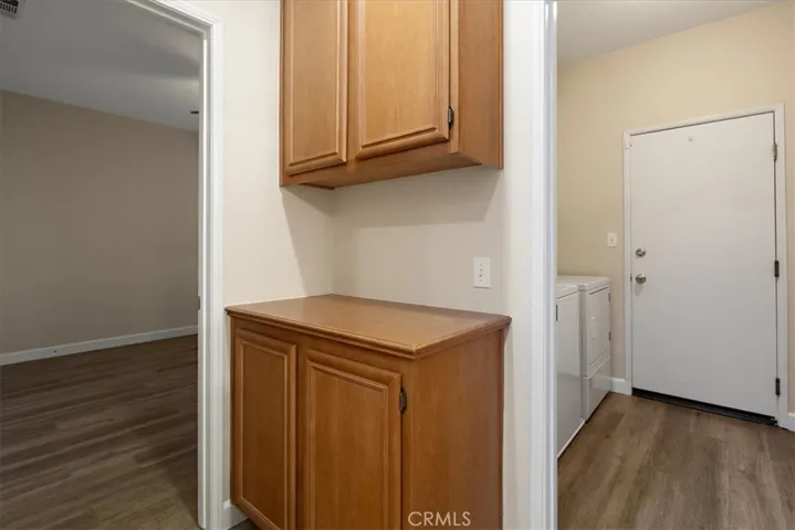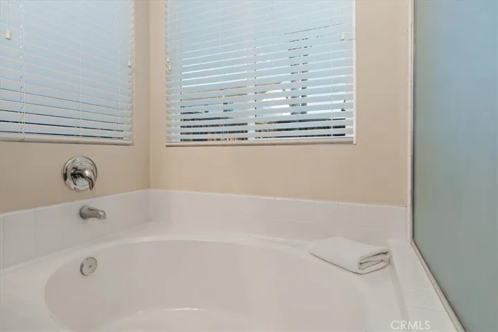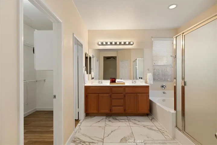 sinks, separate soaking tub & walk-in shower, & custom tile flooring. Additional 3 spacious bedrooms. Laundry area with plenty of cabinet spaces. Backyard features patio area with lattice Aluminum-wood patio cover with concrete walkway each side of the home. Additional features include recently installed wood laminate, complete interior painted, recess lighting, & three car garage.