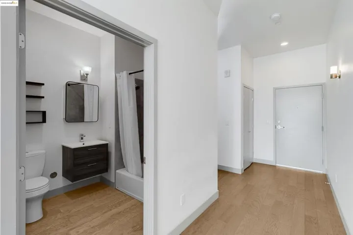 This move-in-ready contemporary condo is priced to sell and perfectly placed in the heart of Oakland’s vibrant Jack London Square. Inside, soaring eleven-foot cathedral ceilings, expansive custom sliding doors, and oversized windows flood the living area with natural light, creating a bright and welcoming atmosphere. The stylish kitchen features stainless steel appliances, a sleek backsplash, soft-closing cabinetry, and a peninsula island ideal for casual dining or gathering. Conveniently tucked next to the kitchen is your in-unit laundry, complete with room for shelving and extra storage. The bathroom feels like a private retreat with a floating vanity and spa-inspired tile shower. A private balcony provides the perfect spot for morning coffee or evening relaxation. The community rooftop deck includes seating areas, BBQ grills, and charming planter boxes. Parking is simple with your designated space in the secure, gated garage. All of this comes with unbeatable access to BART, the ferry, the farmers market, restaurants, parks, and Chinatown—delivering the ideal blend of comfort, convenience, and urban lifestyle. Views: Downtown