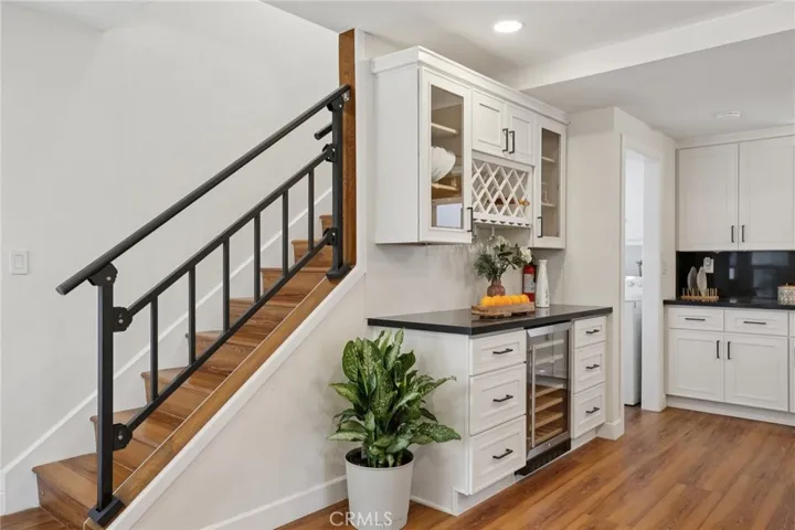 The epicurean kitchen serves as the home’s vibrant heart. It is a chef’s dream, appointed with bold quartz countertops that cascade down the waterfall island, a full-height matching backsplash, a stainless steel farmhouse sink, and high-end appliances. Adjacent, a dedicated beverage center with a built-in wine fridge stands ready for effortless entertaining.