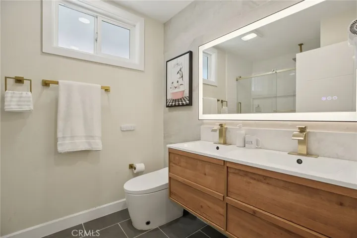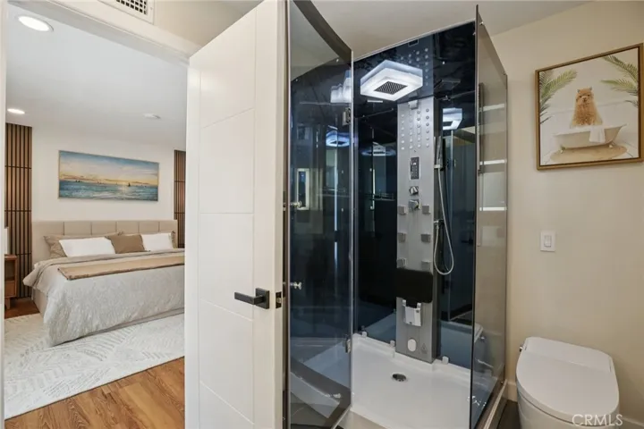 Your private sanctuary awaits in the luxurious primary suite. This serene retreat features its own custom accent walls and a spa-like en-suite bathroom designed for ultimate relaxation. Here, you will find a floating double vanity with a backlit mirror and the home’s crown jewel: a high-tech, enclosed steam shower with a rainfall head, body jets, and a digital control panel—transforming your daily routine into a resort-like experience.