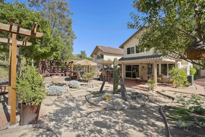 Nestled within 11,000 square feet of gorgeous, drought-resistant landscaping, this impeccably designed and thoughtfully reimagined home seamlessly blends a cozy interior with a tranquil outdoor oasis. Bathed in soft, natural light, the expansive great room is anchored by a beautifully renovated kitchen, tailor-made for anyone who loves to cook. The home features four upstairs bedrooms, one of which is currently configured as a custom built-in home office, along with 2.5 fully remodeled bathrooms and an additional 175-square-foot versatile flex space. Step outside to bask in the serenity of the surrounding yard. Outdoor highlights include a spacious covered patio with ceiling fans, custom landscape lighting, a hot tub, a natural gas fire pit, a tranquil fish pond and waterfall, three raised garden beds, and a quarter-sized basketball court. Additional features of the property include charming casement windows, whole-house water filtration, security screens, a whole-house fan, an upgraded electrical panel, and owned solar.