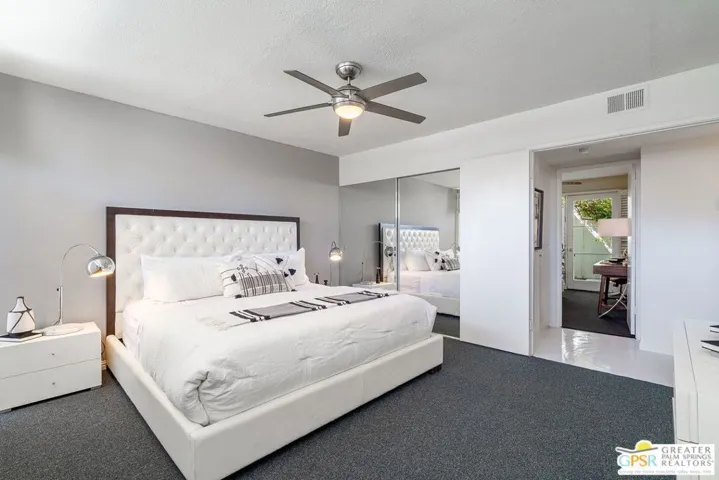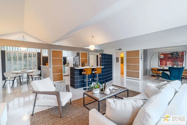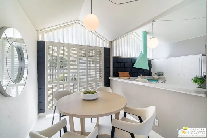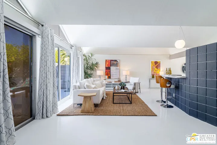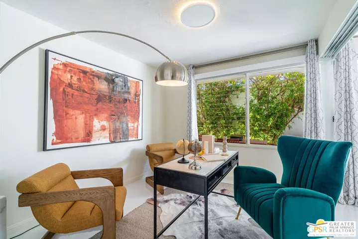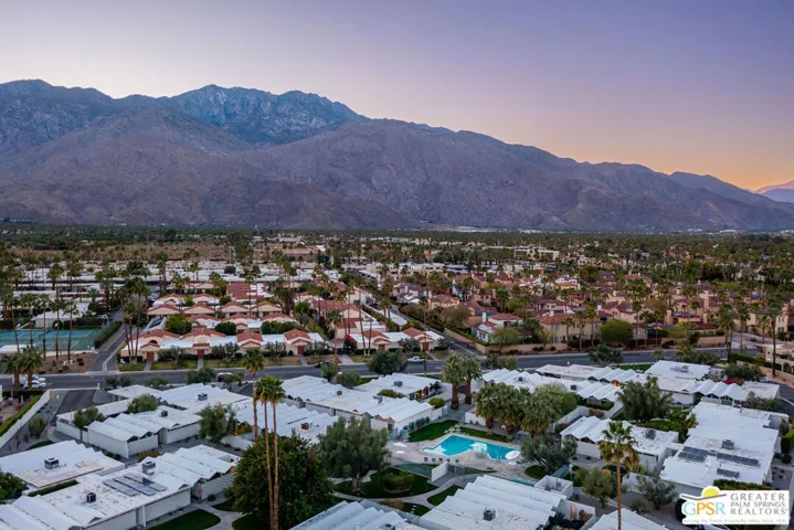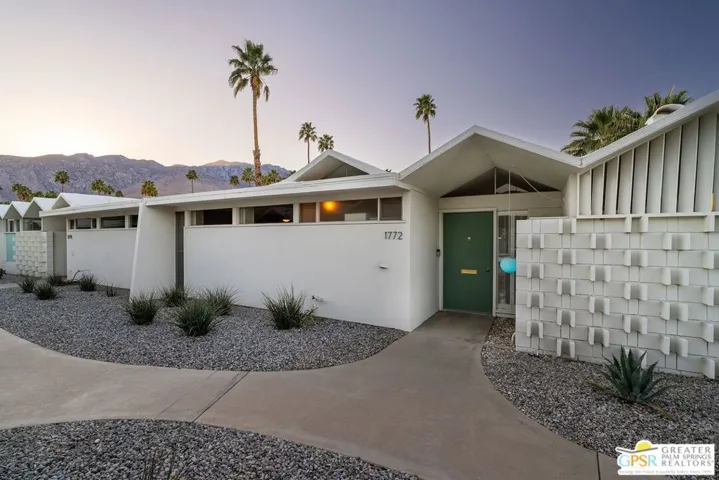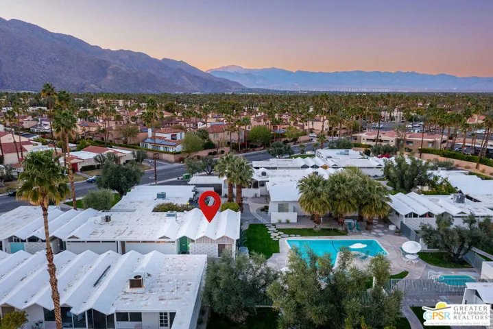 Enjoy the quintessential Palm Springs lifestyle at Park Imperial South, a cool mid-century complex designed in 1961 by Barry Berkus, featuring a signature folded plate roof and bold concrete block styling. For the purist, this residence is virtually original and has one of the best locations among the 30 units, situated off of the main street and just steps to the quiet and serene heated community pool. The spacious living area is ideal for entertaining and you can enjoy mountain views through the sparkling floor to ceiling windows. Original jalousie windows allow soft breezes to wash the interior throughout. Newer quartz countertops compliment original cabinetry, range and hood in this crisp kitchen. Laundry is conveniently located within the primary bath, and the guest bath has the original luxe porcelain sunken tub. The den/office opens to the main living area, but can be closed off with the original shoji screens for privacy or use as a third bedroom. The private patio is expansive enough for lounging in the sun and has a sweet shaded dining area for added protection from the desert sun. Two fruit trees are a lovely bonus. Exterior custom sun shades are provided for most west facing windows. One assigned covered parking space is a short walk from the patio. This is it. Hurry!