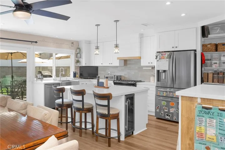 Inside, the home has been thoughtfully updated with a modern, open-concept kitchen, complete with white shaker cabinetry, quartz countertops, stainless steel appliances, and a center island with bar seating. Natural light fills the space, creating a bright and inviting environment that flows effortlessly into the dining area and backyard.