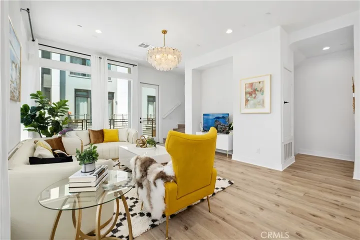Like-New Luxury Upgraded Turnkey End-Unit Residence in Irvine Great Park Neighborhood–Exceptional Value! Just Minutes’ Walk to top-rated Portola High School and Solis Park School (K–8) in the award-winning Irvine Unified School District—daily drop-offs are skipped, making life a true breeze for parents. 3 beds, 2.5 baths, and 1,812 sqft of living space. Premium End Unit boasts superior natural light, enhanced privacy, a quieter setting, a larger front yard, and an L-shaped deck. The expansive Open-Concept Layout seamlessly connects the kitchen, living, and dining areas, enhanced by 10-foot ceilings to create a harmonious flow of space. Oversized windows paired with floor-to-ceiling doors bathe the interiors in abundant natural light, accentuating the home’s spacious design and luxurious appeal. Tasteful upgrades include whole-house wood flooring, whole-house water softening system, and elegant chandeliers. Stunning primary bedroom suite features a walk-in closet, dual vanity, and a walk-in shower. Two secondary bedrooms are generously sized too. The first floor offers ample storage closets and direct access to a side-by-side 2-car garage. Energy-saving features include leased solar system, EV charger pre-wire, energy-efficient windows,and tankless water heater. Just minutes from Woodbury Town Center, Irvine Spectrum Center, and Kaiser Permanente, etc. Enjoy Great Park’s world-class recreational amenities and the state-of-the-art sports complex, with easy access to I-5, 133, 405, and 241. Only 18–25 minutes’ drive to Newport Beach and Laguna Beach.