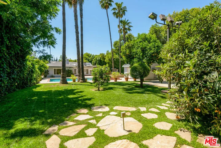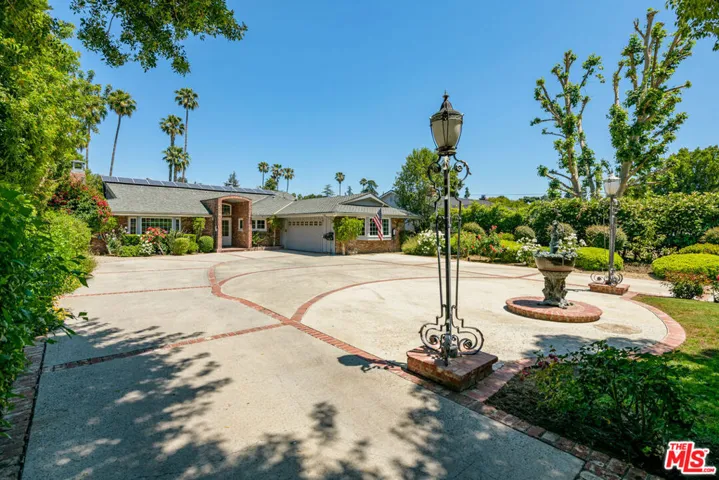 Nestled behind private double gates on an expansive, beautifully landscaped lot, this distinguished single-story estate blends timeless traditional architecture with modern luxury and unmatched privacy. Located in Northridge’s coveted Sherwood Forest enclave, the home offers rare tranquility while maintaining exceptional access to city conveniences.Featuring 4 generous bedrooms and 4.5 bathrooms, the residence is bathed in natural light and thoughtfully crafted for both refined entertaining and everyday living. The heart of the home includes spacious formal and casual living areas, a sophisticated library or home office, and a seamless indoor-outdoor flow ideal for Southern California living. Modern upgrades elevate this home’s comfort and efficiency, including solar panels, three electric car charging stations, and four-zone HVAC systems with individual AC units for tailored climate control. The entertainer’s backyard is a private resort-style oasis, complete with a heated pool and spa, built-in BBQ, mature greenery, and a charming pool house outfitted with a private sauna for the ultimate wellness retreat. A grand circular driveway and attached garage provide striking curb appeal and generous parking for family and guests. As well as a 45 foot RV parking and includes electrical and sewer hook ups. Tucked away on a quiet residential street, this estate is just moments from top-rated schools, shopping, dining, and offers quick access to the 405, 101, and 118 freeways providing a convenient commute to the Westside, Santa Monica, Studio City, and downtown Los Angeles. Whether hosting elegant gatherings or enjoying peaceful afternoons by the pool, this exceptional home is a rare offering that embodies the best of privacy, comfort, and classic California living.