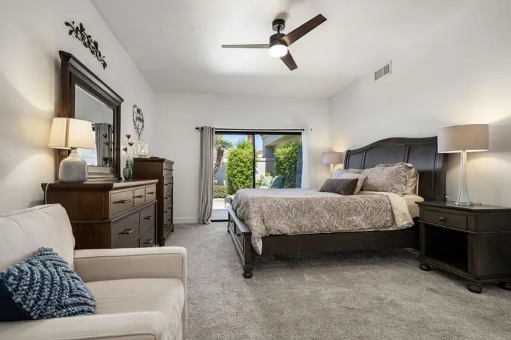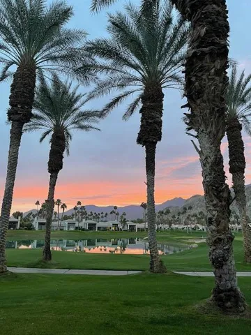 Views, views, views! This home offers stunning panoramic views of the Santa Rosa Mountains, beautiful lake and 4th fairway/green of the Palmer Private Course. With the gorgeous view and 3 bedrooms, all with their own en-suite bathrooms plus a powder room, just relaxing or entertaining are both a breeze.This gorgeous home has recently had a complete top to bottom remodel to include new appliances, new flooring throughout, new or upgraded bathrooms and all new baseboards and paint. The kitchen has been upgraded with granite countertops and designer backsplash. The original fireplace was removed and replaced with a stylish electric fireplace insert and floor to ceiling stone backdrop for a beautiful focal point in the living room. This beautiful home is one of the best quiet and peaceful locations on the Palmer course! Morning coffee or evening cocktail on the patio is the best! Community pool & spa just steps away. Golf Cart included in sale.