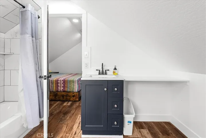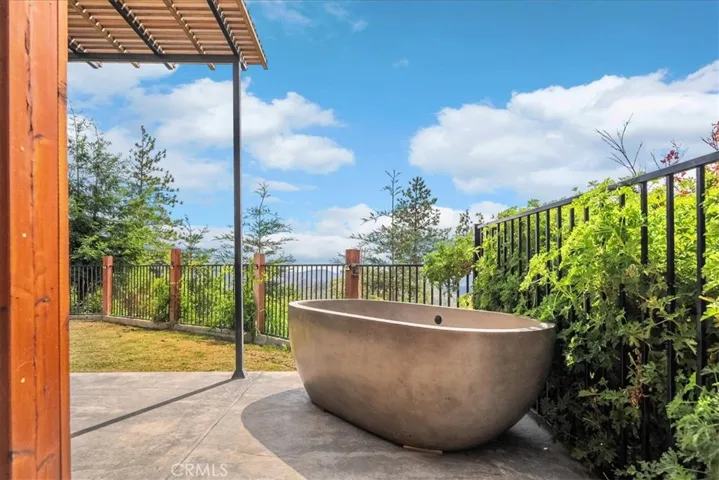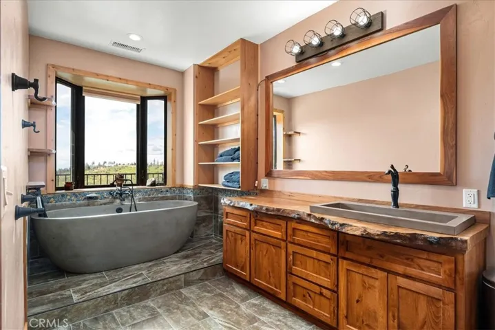 The spacious primary suite on the main floor offers French doors to the patio, a walk-in closet, and an incredible view. The spa-like bath includes a custom oversized concrete soaking tub set beneath a bay window, a live-edge vanity, and a walk-in shower for a true luxury retreat. Upstairs, two generously sized bedrooms share access to the upper deck and a full guest bath.