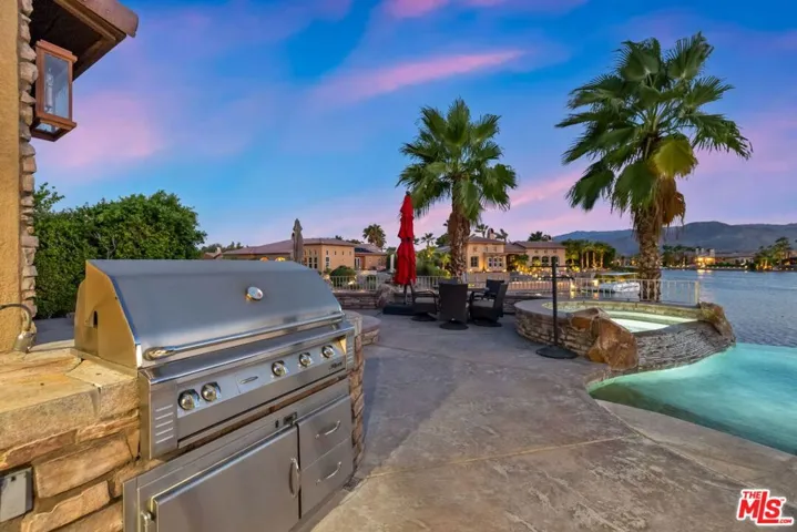 RARE OPPORTUNITY TO OWN ONE OF THE MOST SPECTACULAR AND LARGEST HOMES IN SANTO TOMAS!!! LUXURY LAKE FRONT DESERT LIVING AT ITS FINEST!!! Perfectly situated on a premium SOUTH-FACING lot in the highly desirable gated lake community of Santo Tomas, 64 Via Santo Tomas offers a unique south-facing backyard with plenty of luxurious amenities – infinity pool with a tanning ledge, hot tub, built-in BBQ station, fire pit, fireplace, and steps leading to the massive private dock. Located at the center of the community with unobstructed open water views of the nine acre lake, this home (one of only three) is perfectly situated directly across from the main entrance gate. The 3,350 sqft house boasts four bedrooms and four-and-a-half bathrooms (four are en-suite) with upgraded Kentucky Oak floors, security system, two car garage with plenty of storage space, two indoor fireplaces (one gas and one wood-burning), a bar area, and separation of bedrooms for added privacy. Granite countertops, stainless steel appliances, plenty of cabinets, and a walk-in pantry in the massive kitchen allow for easy entertaining. Two of the bedrooms can be used as an attached casita with a separate entrance door. Home comes fully furnished and has many upgrades – roof (2023), HVAC unit (2024), air conditioned garage, misters in the covered patio, and so much more. Low HOA dues includes a social and sports membership to the Mission Hills Country Club (pool, tennis, fitness, croquet, pickleball, restaurant). Enjoy desert living at its finest!