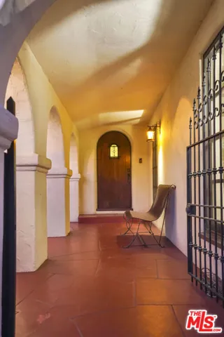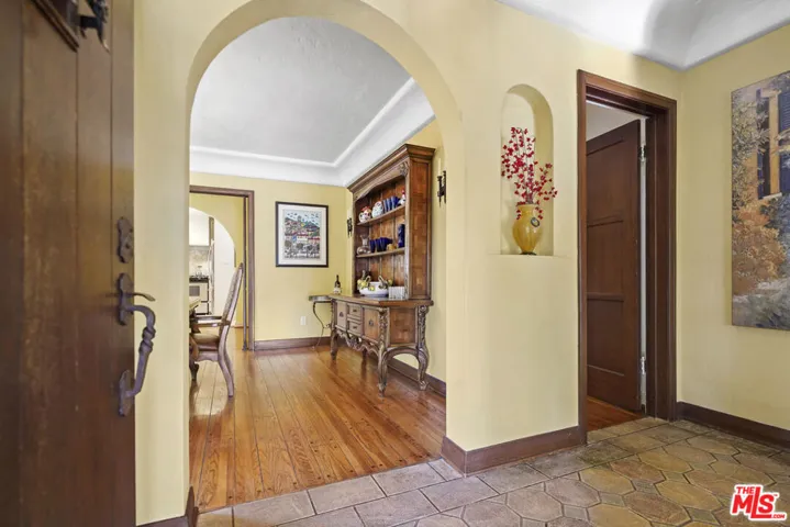 Set behind a classic arched courtyard filled with bougainvillea and the sound of a bubbling fountain, this 1931 Spanish Colonial Revival draws you into something special. Situated in the heart of Glendale’s Rossmoyne Historic District, a neighborhood known for some of the city’s most beautiful Spanish architecture, the home balances historic character with thoughtful updates that respect its past. The carved wooden front door opens to a welcoming entry where soft arches and a magnesite floor create an elegant first impression. From here, step down into the living room with its original French windows, vaulted beamed ceiling accented with hand-stenciled details, and a fireplace surrounded by handmade tiles from the historic Markoff Mosaic Tile Corporation. Peg-and-groove hardwood floors carry through much of the home, bringing warmth and texture to each space. Across from the living room, the dining room looks onto the courtyard fountain and offers generous proportions, setting the stage for gatherings. The updated kitchen is bright and functional, blending seamlessly with the home’s style and offering plenty of room for cooking and connection. One and 3/4 bathrooms reflect the home’s 1931 roots with restored tilework, while three bedrooms provide comfortable retreats, including an en-suite that opens to the veranda and backyard. Outdoors, a flagstone-paved yard surrounds the expansive spa beneath twinkling lights and umbrellas, framed by stucco walls and mature greenery. The shaded veranda just off the house offers a relaxed spot to lounge or entertain, making the backyard feel like a private retreat. Additional updates include copper plumbing, newer central air and heat, and a bolted foundation. 1148 Cordova is a home where history feels alive and daily life fits right in.