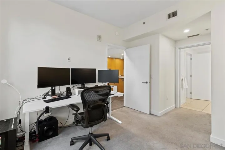 Situated on the coveted northwest corner of Aria in the tranquil Cortez Hill neighborhood, this refined residence offers a seamless blend of style and function. A thoughtfully designed open floor plan showcases an updated kitchen with sleek quartz countertops highlighted by a waterfall edge, premium stainless steel appliances, generous cabinetry, and a breakfast bar for four. The light-filled living room is framed by oversized windows and opening to a spacious entertaining balcony for effortless indoor-outdoor living. With a split layout that maximizes privacy, the two primary suites are situated on opposite sides of the home—one enjoying dramatic corner windows, a walk-in closet, and a contemporary ensuite bath with dual vanities and walk-in shower, while the second offers its own ensuite retreat ideal for guests or extended stays. Additional features include motorized living-room shades, full-size in-unit laundry, and two assigned garage parking spaces. Residents of Aria indulge in resort-style amenities, from a sparkling 70-foot lap pool, spa, and state-of-the-art fitness center to a stylish resident lounge and the peace of mind of on-site management and secured FOB entry. Perfectly positioned at the edge of downtown, Aria combines the serenity of Cortez Hill with the convenience of city living—minutes to Balboa Park, Little Italy, Petco Park, the Embarcadero, and the Gaslamp Quarter, with easy access to San Diego International Airport and major freeways. This is sophisticated urban living at its finest.