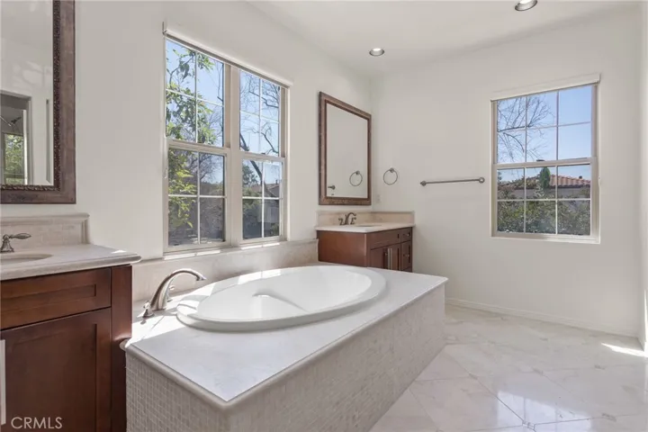 Charming 3-bedroom, 3-bathroom home with recently updated kitchen features brand new stainless steel appliances, neutral wood cabinetry, granite slab counters, and a stylish designer tile backsplash. Brand new vinyl floors throughout with travertine and marble floors in bathrooms and kitchen, complemented by wood shutters, custom drapes, and designer roman and silhouette shades that add a touch of sophistication. The master suite is a true retreat, boasting an oversized walk-in closet with a mirror door, and a lavish master bath with marble, tile, and stonework, along with custom framed designer mirrors and dual vanities.