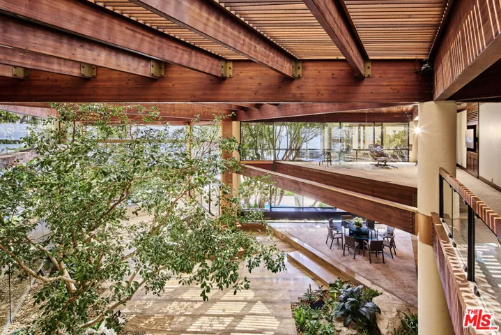 A Point Dume legacy estate of rare provenance and architectural significance, once home to legendary host Johnny Carson, this extraordinary compound spans over four pristine acres across four parcels, commanding panoramic views of the Pacific Ocean, Queen’s Necklace, and Paradise Cove. Designed by renowned architect Edward R. Niles, the residence is a sculptural interplay of glass, wood, and geometry, a modernist composition that rises dramatically above the bluffs. At its heart lies an awe-inspiring arboretum pavilion, where a soaring 30-foot glass ceiling latticed with wood slats floods the interiors with natural light. Anchored by a striking copper and glass sunken fireplace encircled by built-in seating, this space seamlessly transitions to bluff-top terraces, a koi pond, and cascading water features. The main level flows effortlessly between dramatic entertaining areas and intimate retreats: a triangular dining room with ocean and pool vistas, a black marble and wood bar lounge, a chef’s kitchen with butler’s pantry, and a glass-walled office that appears to float among the trees. On the lower level, an ocean-view lounge with wet bar opens to expansive terraces, complemented by a screening room and an impressive wine cellar. Occupying the entire upper floor, the primary suite is a sanctuary of luxury, with dual spa-inspired bathrooms, expansive walk-in closets, two private offices, and a fireplace-adorned bedroom opening to a private terrace with whitewater views.The grounds are an oasis of curated gardens, sweeping lawns, and specimen trees. A saltwater pool with grotto waterfall, Jacuzzi, sauna, and cold plunge invite relaxation, while al fresco dining terraces capture the drama of Malibu sunsets. Additional estate features include a circular glass security office with kitchenette and bath, a staff cottage, and motor facilities with three-car garage, Tesla chargers, and capacity for up to 40 vehicles. Across a separate parcel lies a championship tennis complex, framed by manicured rose gardens and sculpture installations. The travertine tennis pavilion offers two guest suites, a full kitchen, fireplace lounge, spa-style locker rooms with sauna, and expansive courtside terraces. Additional guest accommodations include a private guesthouse, greenhouse, fruit orchard, and aviary.A true Malibu icon, 6962 Wildlife Road embodies the convergence of architectural artistry, land, and legacy, creating an estate of unrivaled beauty, privacy, and prestige.