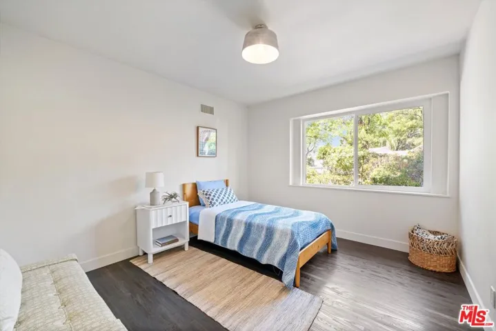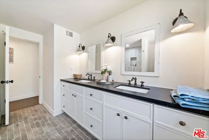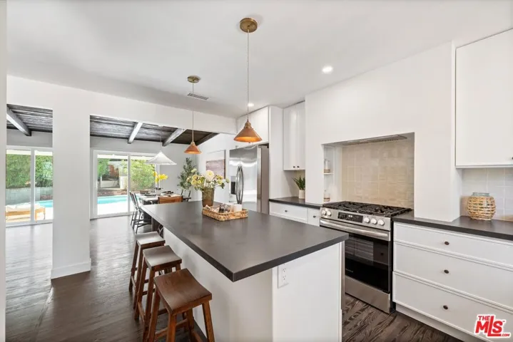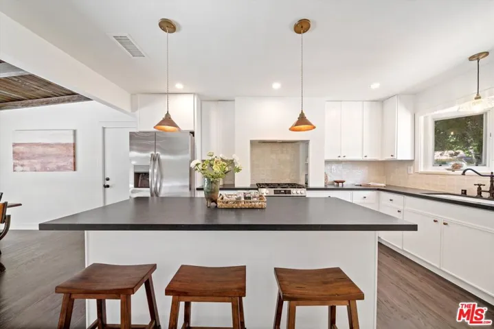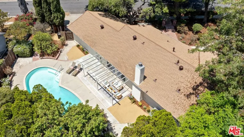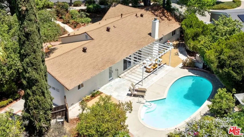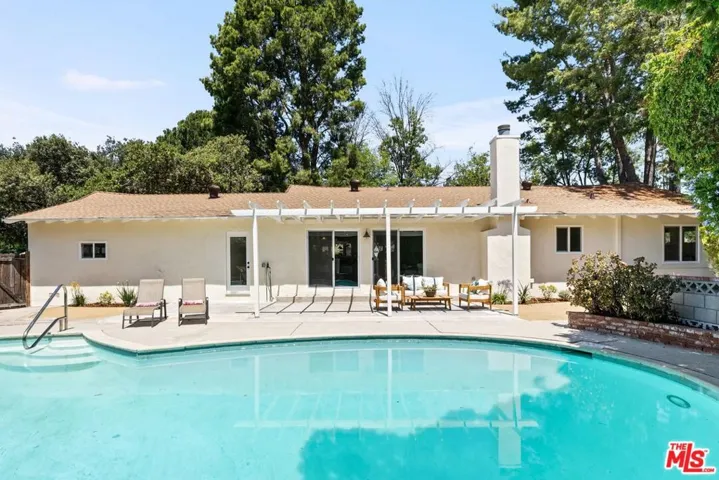 Beautifully remodeled ranch-style pool home on a picturesque corner lot in desirable Porter Ranch. This single-level residence blends timeless curb appeal with fresh, modern updates and an effortless indoor/outdoor flow. Inside, an airy great room showcases dramatic dark tongue-and-groove beamed ceilings, refinished wood flooring, and a whitewashed stone fireplace that anchors the space with character. Wide sliding glass doors usher in natural light and open directly to the backyard retreat. The dining area connects seamlessly to a showpiece, all-new chefs’ kitchen crafted with sleek shaker cabinetry, richly hued quartz countertops, hand-set zellige-style backsplash, warm brass pendant lighting, a spacious island with seating and stainless appliances. The serene primary suite enjoys leafy views and a beautifully renovated en-suite bath featuring a double wood vanity, quartz counters, stylish sconces, and a large glass-enclosed shower lined with artisan tile. Two additional bedrooms are bright and generous, with ample closet space. Chic hallway bath echoes the home’s curated palette with a long double vanity, matte black fixtures, and designer tile. Backyard features a sun-drenched sparkling pool, expansive patio for lounging and dining beneath an elegant white pergola, raised brick planters, mature landscaping, and tall hedges for exceptional privacy. All set on an expansive 11,000+ sq ft corner lot with multiple zones for play, gardening, and gatherings. A side decked gazebo adds another shaded nook, and the attached two-car garage plus driveway parking provide everyday convenience. Moments from parks, hiking trails, shopping, dining, this turnkey home delivers style, comfort, and charm in a prime location. THIS IS A MUST SEE!
