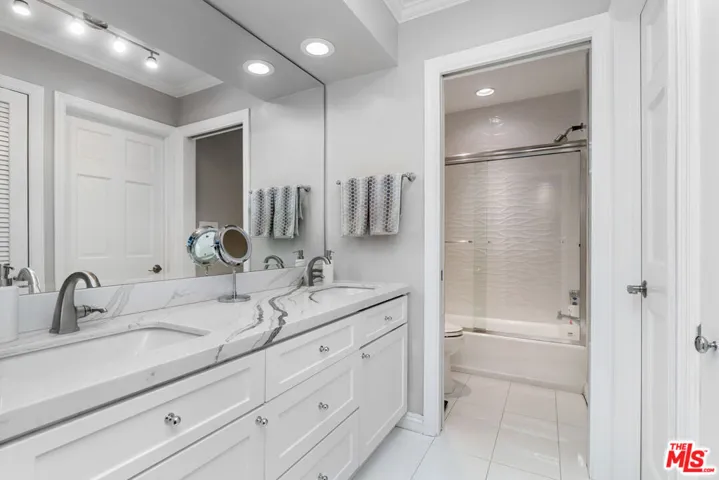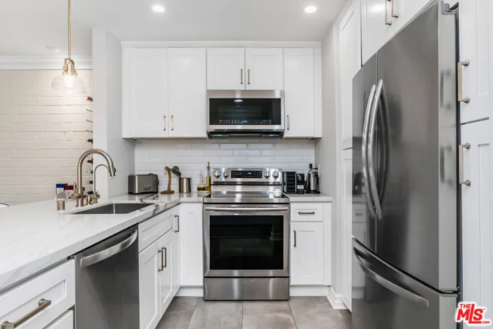 Beautiful re done condo. on a high floor with beautiful mountain views and views of the Getty Museum. This unit has been remodeled with an open kitchen with Marble black and white counter tops. The open kitchen opens up to a spacious living room and a large balcony. The bathroom has been remodeled as well. And best of all, it has an in unit full size washer and dryer. You can walk to the coffee shops on Barrington. This centrally located unit is in a very quiet building.