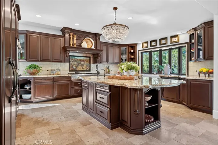 As you enter, walls of windows draw your eye to breathtaking mountain and city-light views, bathing the interiors in natural light. The expansive living spaces feature wide-plank wood floors, luxurious travertine, rich wood trim, and custom ceilings. The gourmet kitchen is a chef’s dream with a massive island, top-of-the-line Thermador appliances, and a large walk-in pantry with hidden storage, all while open to the family and living rooms.