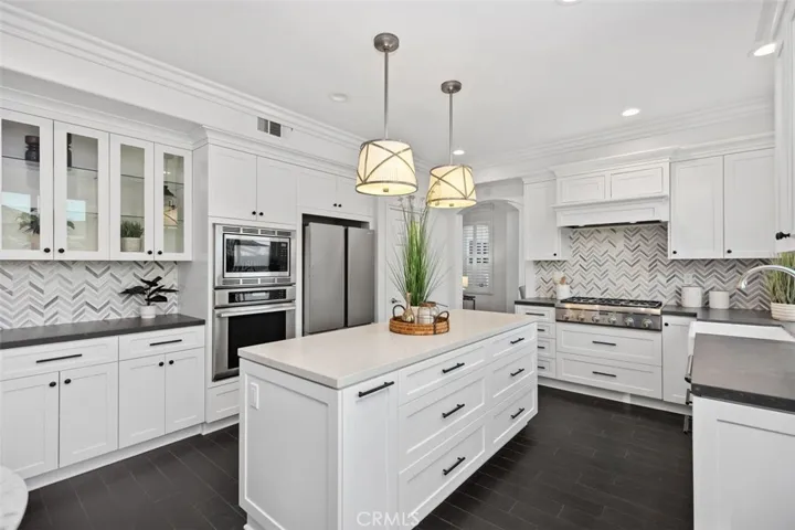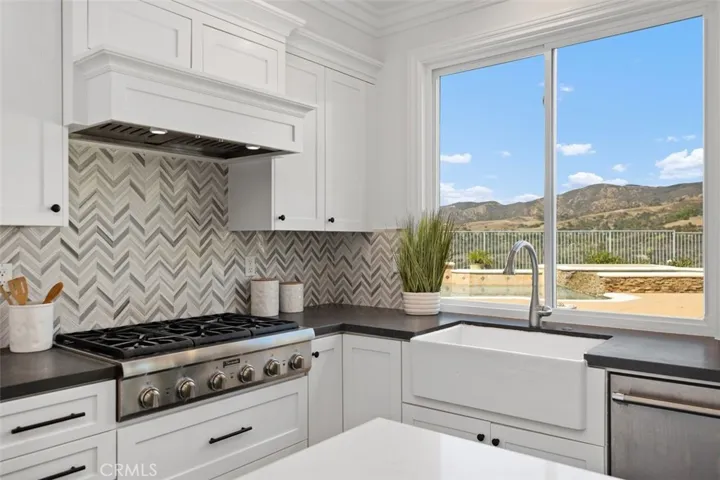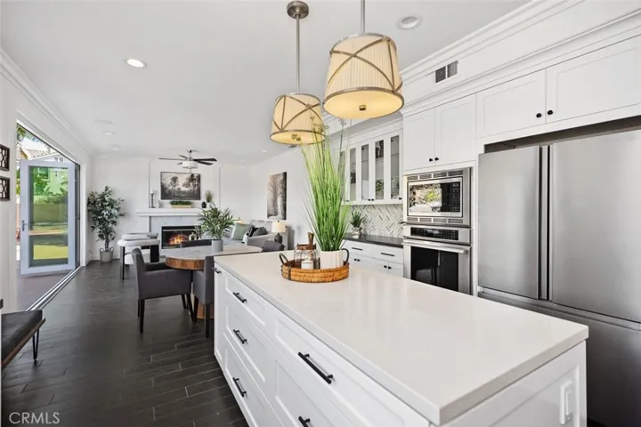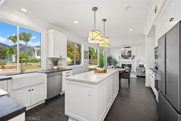 The exterior features a brick-accent façade, a covered front entry with double doors, and a front patio area. The interior has been recently repainted and offers high ceilings, crown molding, and large windows. Flooring includes dark wood-look tile on the main level and plush carpet upstairs. The formal living room has two-story ceilings and abundant natural light, and the formal dining room has direct access to the backyard through sliding glass doors. The remodeled kitchen includes white shaker cabinetry, quartz countertops, a large center island, and a herringbone-pattern backsplash. A farmhouse sink overlooks the backyard and mountain views. The kitchen opens to a family room with a fireplace and folding glass doors. The main floor also includes a bedroom/office with a ceiling fan and a bathroom with a shower.